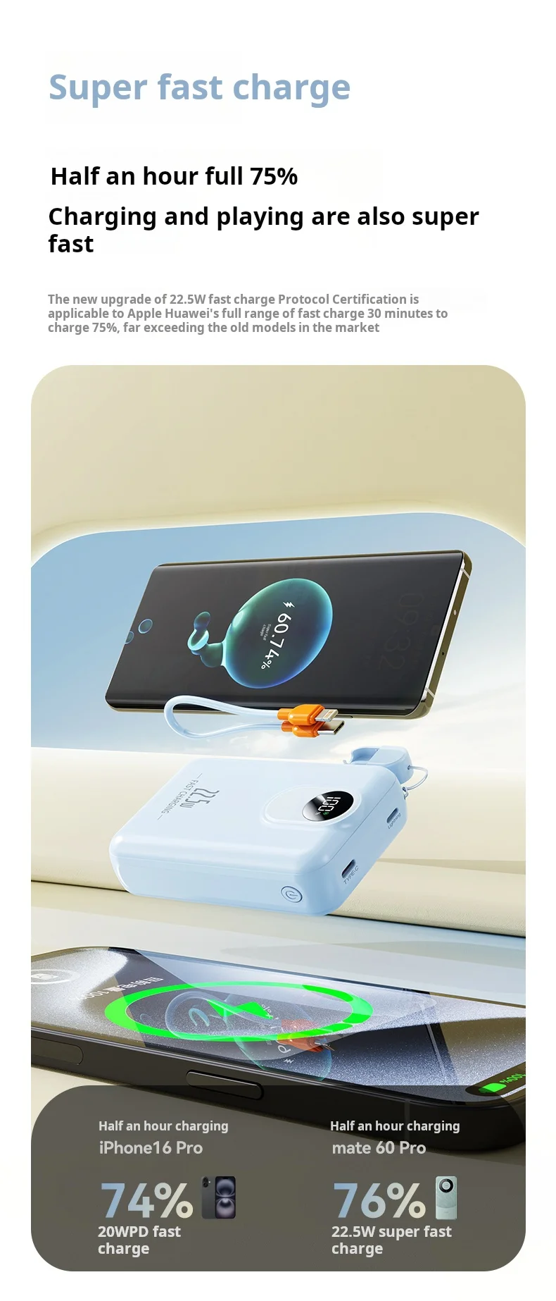 Portable 10000mAh Mini Power Bank with 22.5W Built-in Cable and LED Display Type-C and USB Input Interfaces Small Phone Charger