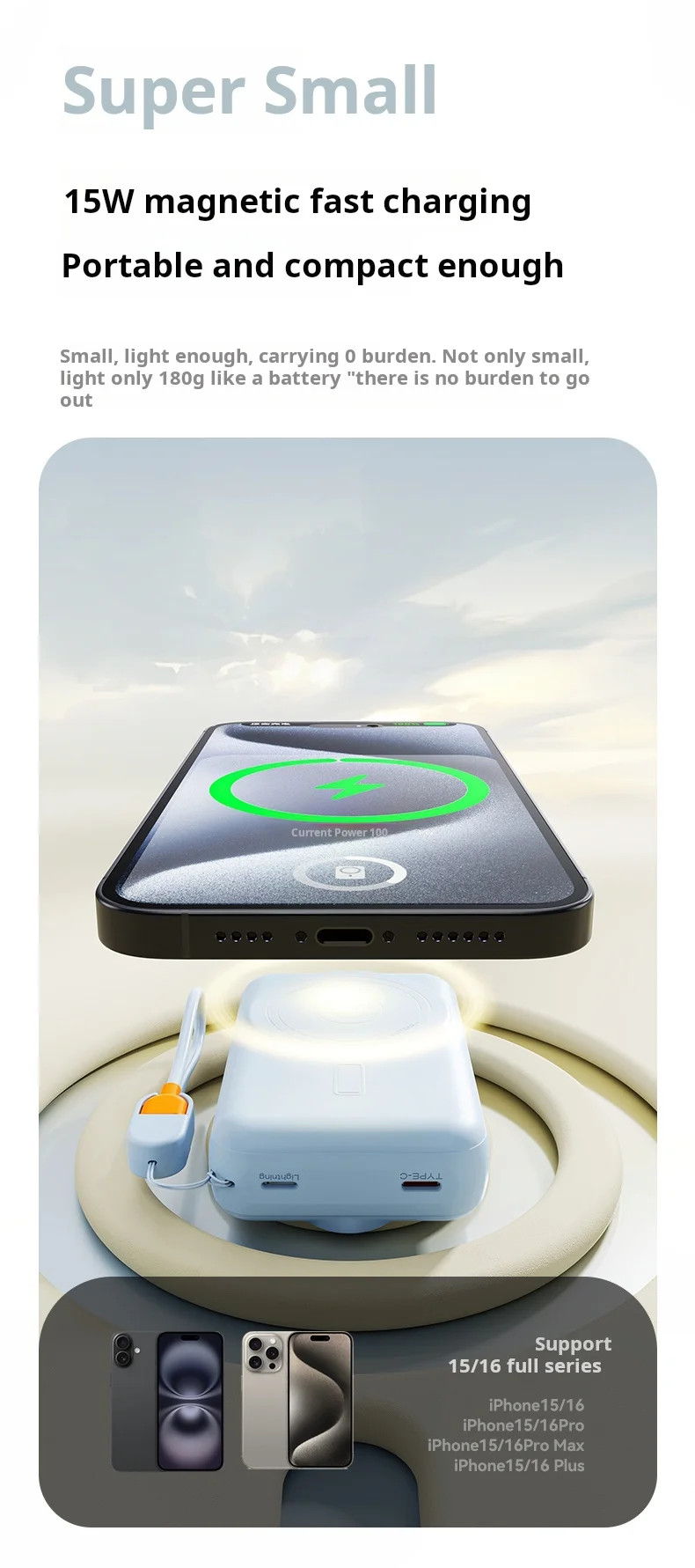Compact appearance with built-in Typc-C/Lightning dual head fast charging cable
